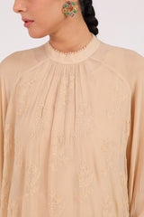 A hand-embroidered shirt with a round neckline featuring subtle gathers and a lace trim. Delicate hand embroidery enhances its charm, while cuffed sleeves add a refined touch. Comes with an inner for added comfort and ease.