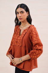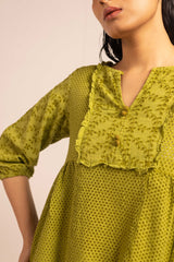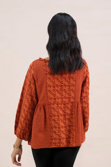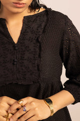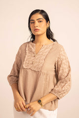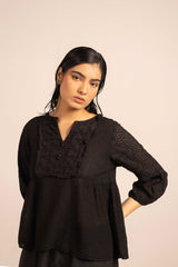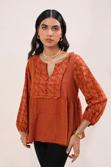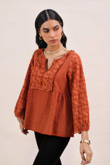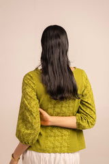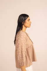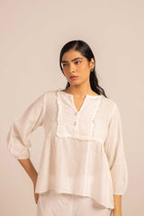 An exclusive schiffli solid top featuring a round neckline with a V-slit and a button-detailed placket. The square-shaped gathered frill on bodice and cinched sleeves add timeless charm. Can be paired with any generation fits for a sophisticated look.