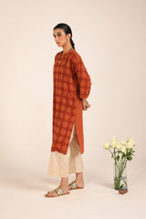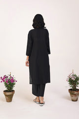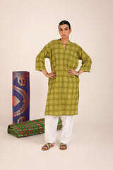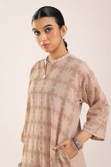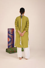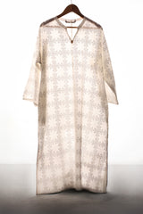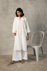 A classic-fit kurta featuring a custom-made Schiffli pattern enhanced with intricate embroidered detail, a band neckline with a V-slit, and delicate shell details for a refined touch. Can be paired with any generation bottoms for a complete look.