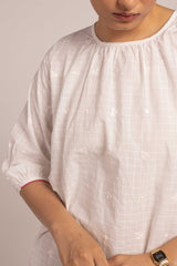 A classic-fit self-embroidered kurta with a round neckline, featuring delicate gathers around the neckline. The cinched sleeve hems are adorned with vibrant lace details, and the side slits showcase intricate stitch detailing. Paired with Rang Bahar printed culottes, this set combines style with elegance.