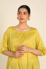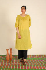 A loose-fit, solid-hued kurta featuring a round neckline adorned with delicate gathers. The cinched sleeves add a subtle touch of structure. Can be paired effortlessly with any Gen fits.