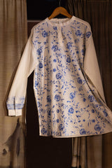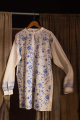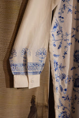 Classic-fit self-embroidered top with a drop-shoulder design, a low band neckline, and buttons along the front placket. The silhouette is elevated with cuffed sleeves adorned with colorful embroidery, bringing a subtle yet funky charm.