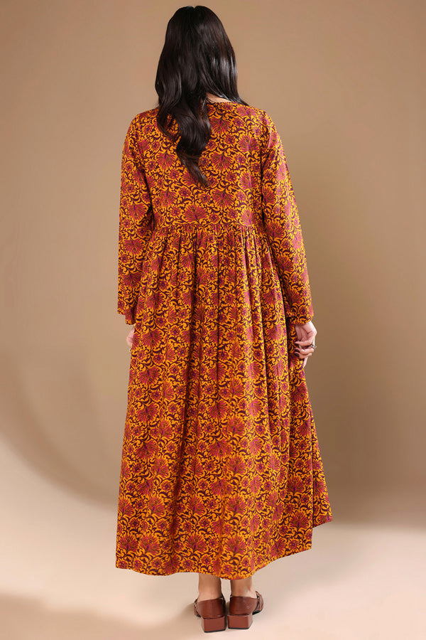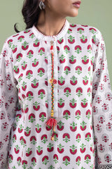 A vibrant floral block-printed kurta featuring a band neckline adorned with delicate stitching. The front placket is enhanced with colorful braids and tassel detailing. The lively floral prints add depth, charm, and sophistication to the look. Pairs effortlessly with any generation bottoms for a versatile style.