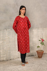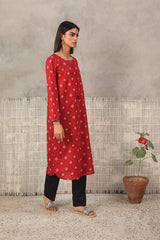 A classic fit kurta featuring a vibrant print, round neckline with a V-slit, and delicate tassel details. The neckline and sleeve hems are adorned with subtle, colorful embroidery. Pair with any Gen bottoms for a versatile look.