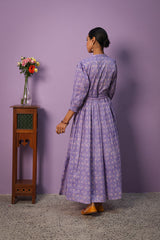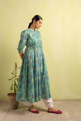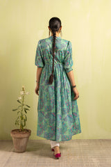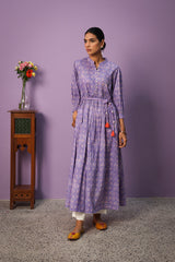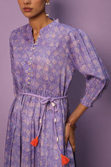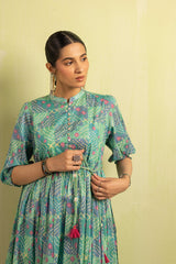 A classic-fit Chunari printed flared frock featuring a band-round neckline with delicate buttons on the front placket. The gathers around the empire waist create a nice drape, further enhanced by a braided tie-up belt. The cinched elastic sleeve hems add a soft finish. The intricate Chunari print, infused with traditional motifs and vibrant hues, complements the voluminous flare. Can be paired with any Generation fits for a complete look.