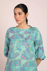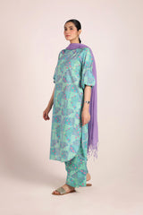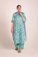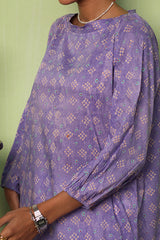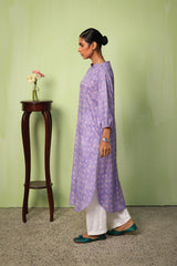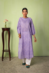 A relaxed-fit long kurta adorned with soft, painterly prints that echo delicate chunari artistry. Featuring a round neckline, the silhouette is effortlessly graceful, while cinched sleeves add a touch of structured charm. This versatile piece can be styled with any generation fits for an elegant yet effortless look.