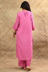 Classic-fit paneled schiffli shirt designed with a round neckline and buttoned placket, adorned with delicate embroidered detailing. Finished with schiffli accents along the sleeves and styled with matching culottes featuring coordinating schiffli borders. Comes with an inner for added comfort and ease.