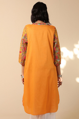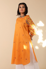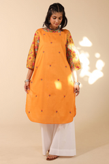 Classic-fit shirt featuring a printed shawl neckline and printed soft puff sleeves. Adorned with delicate embroidered floral motifs on the front and finished with a rounded hemline. Style it with your preferred Generation bottoms for a refined look.