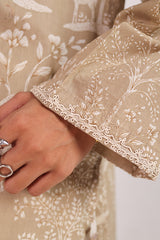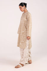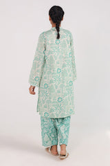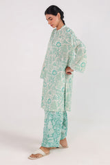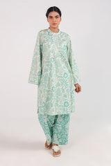 A classic-fit printed shirt with a low band neckline and button detail on the front placket, adorned with lace trims on the placket and sleeve hems. Paired with a printed classic-fit shalwar.