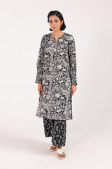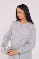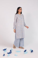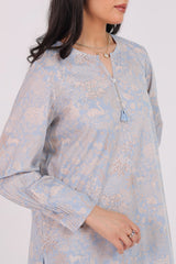 A classic-fit printed shirt with a round neckline and V-slit, adorned with tassel detailing. Soft pleats on the sleeves add a gentle touch. Paired with complementary culottes for a complete, coordinated look.