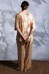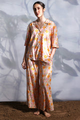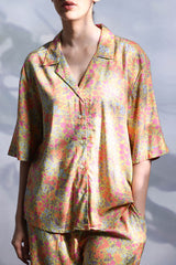 A relaxed-fit printed shirt with a collared neckline and buttons along the front placket, styled with half sleeves. Paired with matching printed trousers for an easy, coordinated look.