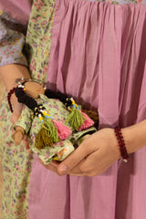 Thoughtfully crafted from surplus fabric, this playful doll wears a classic GEN outfit, with beaded accessories and matching polymer clay shoes. Her hair is crafted into braids using textured yarn and accessorized with colorful tassels. Comes with a keyring for easy use. Every piece is unique and slightly different from the others.
