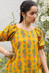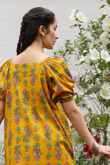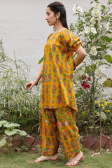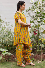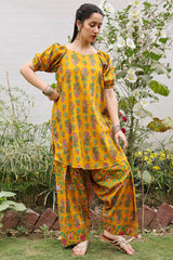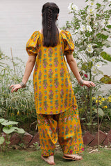 Printed relaxed boxy-fit shirt with subtle puff sleeves and cinched sleeve hems. Finished with a rounded hem. Paired with a matching printed farshi shalwar.