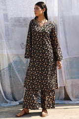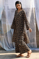 Printed classic-fit shirt with a round neckline and V-slit, adorned with delicate embroidered detailing. Paired with matching printed culottes.
