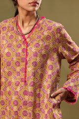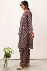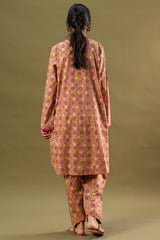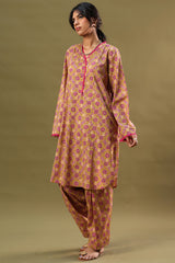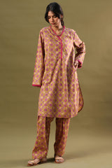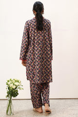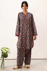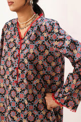 Printed classic-fit shirt with a V-neckline, adorned with delicate fringe detailing along the neckline and sleeve hems. Featuring side pockets and finished with a round hem. Paired with matching printed classic-fit shalwar.