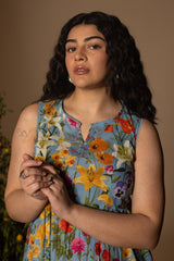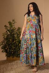 Long floral-printed tiered frock with delicate lace detailing along the neckline and sleeve hems. Soft gathers create a generous flare in the silhouette.