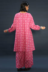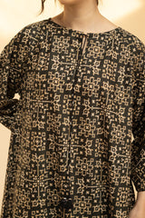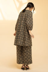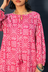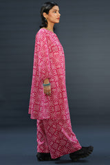 Classic-fit printed shirt with a round neckline and V-slit, adorned with tassel detailing. Cinched sleeve hems add subtle definition. Paired with matching printed culottes.