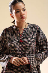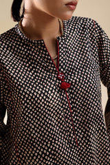 Paneled printed kurta with a round neckline and V-slit, adorned with delicate tassel detailing. Paired with a matching printed khula poncha shalwar.
