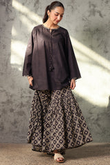Relaxed-fit printed shirt featuring a round neckline with a V-slit, adorned with delicate tassel detailing. Finished with printed border detailing along the neckline and sleeve hems. Paired with a coordinated printed gharara.