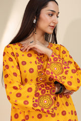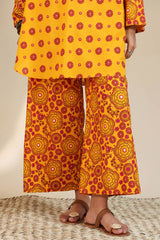 Classic-fit printed shirt with a round neckline and V-slit, subtly embellished along the front slit and finished with a softly rounded hem. Paired with coordinated printed culottes.
