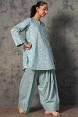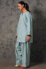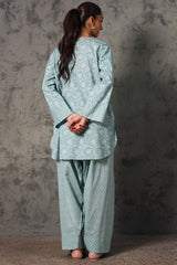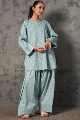 Floral-printed relax-fit shirt with mukaish detailing along the front slit, finished with a rounded hemline. Paired with a coordinated printed farshi shalwar.
