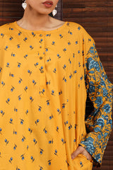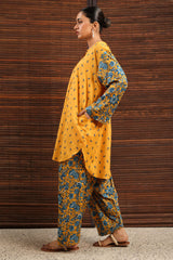 Classic-fit printed shirt with a round neckline and a buttoned front placket. Designed with subtle drop shoulders, side pockets, and a rounded hemline. Paired with a coordinated printed classic-fit shalwar.