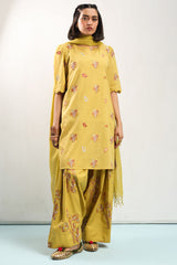 Embroidered classic-fit shirt with a square neckline, adorned with delicate crochet lace detailing. Designed with subtle puff sleeves, finished with lace accents along the hemline. Styled with a cotton check dupatta. Comes with an inner for added comfort and ease. Paired with a coordinated embroidered farshi shalwar.