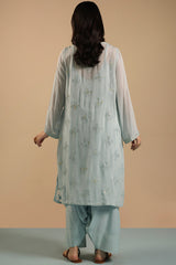 Embroidered classic-fit shirt with a round neckline and V-slit, adorned with tassel detailing. Embroidered work detailed with panni work. Comes with an inner for added comfort and ease. Paired with a farshi shalwar finished with stitching detail.