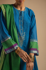 Classic-fit shirt with embroidered detailing along the neckline, complemented by jacquard accents along the sleeve borders. Paired with a tonal farshi shalwar, finished with stitching detail along the borders. Comes with an inner for added comfort and ease. Styled with a coordinated dupatta, framed with jacquard borders and finished with gota tassel accents for a refined, festive look.