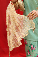 Sheer organza dupatta featuring a softly crinkled texture with subtle metallic linear detailing throughout. Finished with delicate tassel accents, adding lightness and graceful movement to the look.