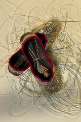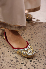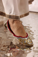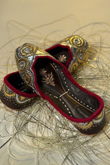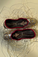 Handcrafted multi-toned leather khussa adorned with intricate Mukesh work, celebrating vibrant tradition with a refined edge. Designed with a smooth leather upper and matching leather lining for a seamless finish. The leather in sock ensures comfort, while the sole is completed with delicate floral embossing.