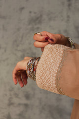 Woven in rich jacquard, this classic-fit shirt features a round neckline accented with dori embroidery and gota detailing around the neckline and sleeves. Paired with an embroidered classic-fit shalwar featuring jacquard borders, and subtle gota accents at the hem.