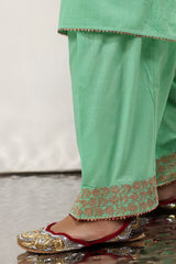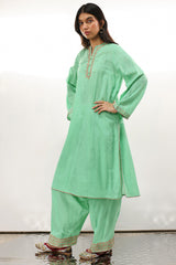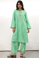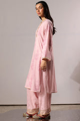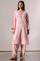 Hand-block printed classic-fit shirt with a round neckline and V-slit, adorned with delicate embroidered detailing and button accents along the front slit. Finished with delicate gota lace detailing along the edges. Paired with a classic-fit shalwar adorned with embroidered borders and gota lace detailing along the hemline.