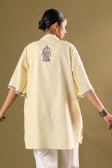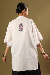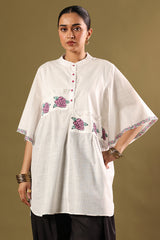 Hand-block printed shirt with a low band necklace and buttoned front placket. Delicate floral print panel with gathers at the front creates a relaxed, flowy silhouette. Flared sleeves are finished with printed border detailing. Style it with your preferred Generation bottoms.
