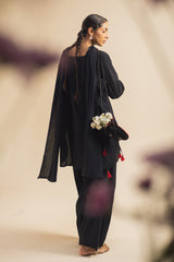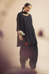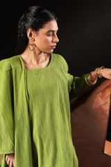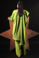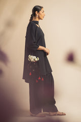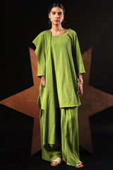 Classic-fit crinkle shirt with a round neckline, relaxed shoulders and rounded hemline. Paired with flared culottes and styled with a matching scarf for a coordinated chic look.