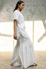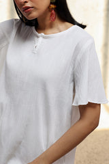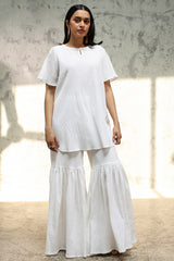 Classic-fit crinkle shirt with a keyhole neckline and soft flared sleeves. Designed with a rounded hemline for refined finish. Paired with a generously flared gharara.