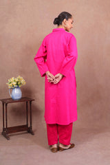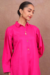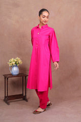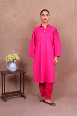 A solid micro check shirt with front pleat detail, volumnous balloon sleeves and band neckline.Paired with a matching Shalwar.