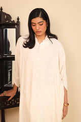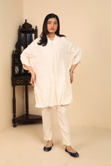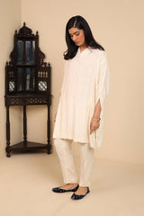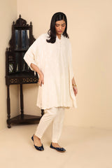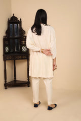 The white Kurta features a scalloped neckline and hems, with a pearl tassel detail on the neck. The slit sleeves add a modern touch. Paired with white cigarette pants, this ensembles offers a chic and sophisticated look.