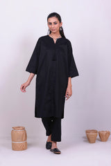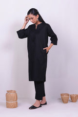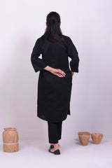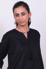 Straight self printed shirt with pocket on sides. Flared sleeves with beaded detail. Round neckline with V shape dip and tassels. Paired with a matching trouser.