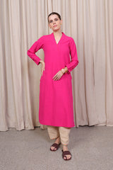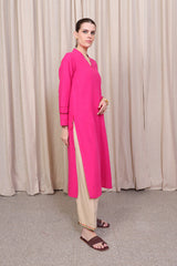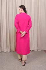 A long kurta with V shaped neckline, with tarkashi details on full length sleeves, tassels on chaak and hand embroidered accents on neckline.