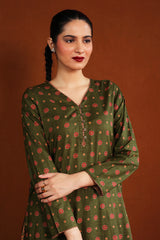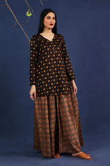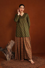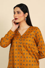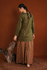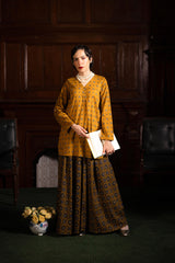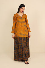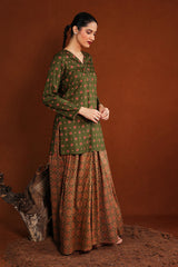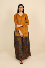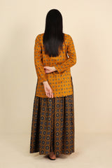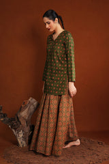 A printed fitted short kurti with buttons along the placket on a V neckline. Paired with contrasting printed skirt.