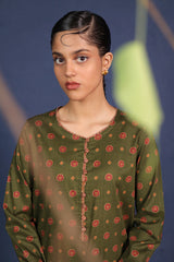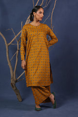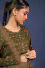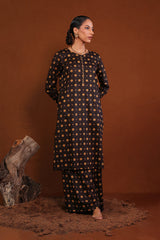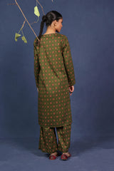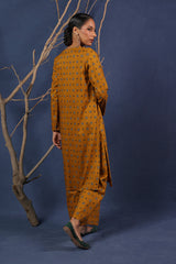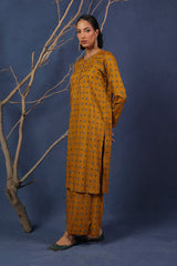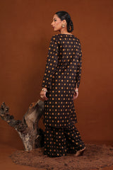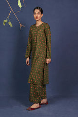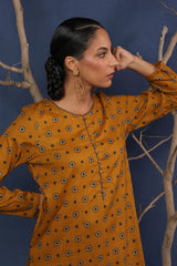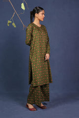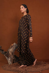 A printed fitted shirt with round neckline and full sleeves featuring button along the front placket. Paired with matching printed wide leg culotte trousers.