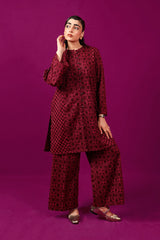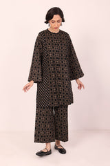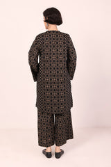 A loose fit printed front open panelled shirt with round neckline, featuring buttons along the front. Paired with a matching printed culotte trousers.