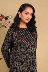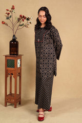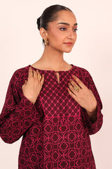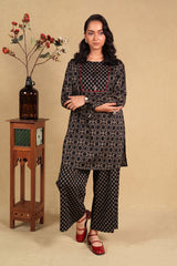 A loose fit printed shirt with print blocked bodice detailing and tassel detailing at neckline. Paired with printed culotte trousers.