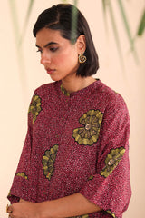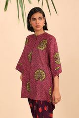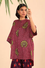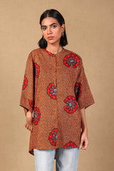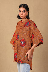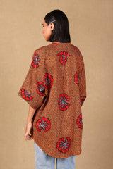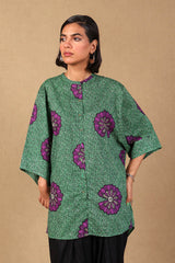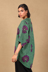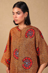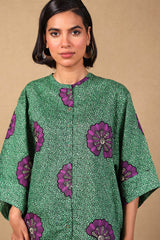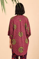 A loose fit printed front open top with round neckline and buttons along the front, featuring batwing sleeves.