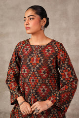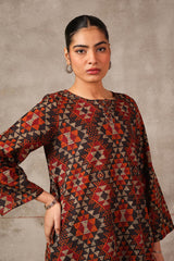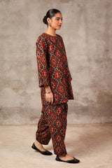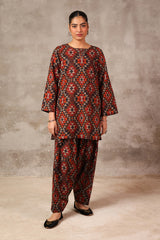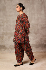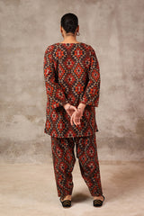 A short a-line printed tunic with round neckline and minimal stitches on placket featuring. Paired with matching printed culotte trousers