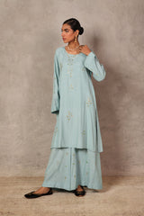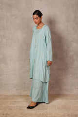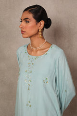 A delicate fusion of elegance and ease, the Chandni Sequin Kurta Set features a loose-fit embroidered kurta with a classic round neckline. The neckline and front placket shimmer with subtle sequin embellishments, while scattered floral sequin motifs add a soft radiance throughout. Comes with an inner. Paired with wide-leg trousers adorned with matching hued sequin motifs, this ensemble exudes effortless grace..