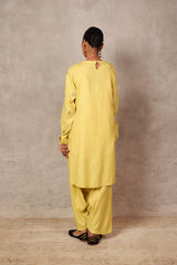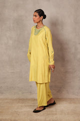 A loose-fit, solid-hued kurta features a classic round neckline, delicately adorned with subtle sequin detailing that extends to the shoulders. The cinched sleeves add a hint of structure, further enhanced by shimmering paisley sequin motifs. Paired with matching solid wide-leg trousers.