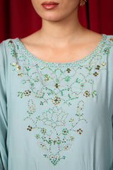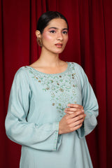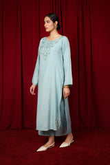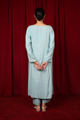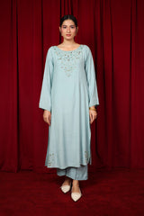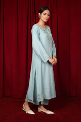 A formal paneled kurta featuring a round neckline, adorned with delicate adda embroidery. The neckline is embellished with shimmering sequin work, extending to the sleeve hems and subtle motifs placed on the shirt’s corners. Paired with matching straight-fit trousers and comes with an inner (shameez) for an eternal look.