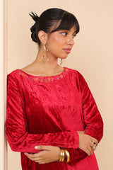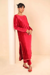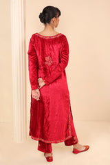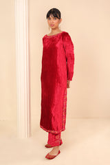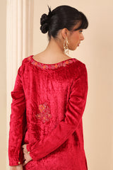 Straight fit velvet shirt with marorri and velvet taanka embroidery details on necklines, shirt hem and sides & back motif. The shirt is paired with matching pants adorned with embroidery motifs.